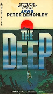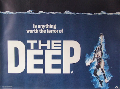 I didn't read it, to avoid spoiling the story, hoping that it was going to be another Jaws-strength movie experience. The Deep was sold to remind everyone of its links with Jaws, misleading the potential audience. The poster is a clever reversal of the Jaws poster (but also far less sensational) with female swimmer now under the surface. Was The Deep going to be a sequel to Jaws? I didn't even know the answer to that when I first sat down to see The Deep at the cinema...