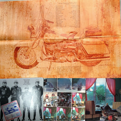 One of the posters folds out to six times the size of the album, again of the painting, but with added lists of handwritten technical details about the bike. For scale, here's a shot of the poster (above) over the album cover and the open booklet.